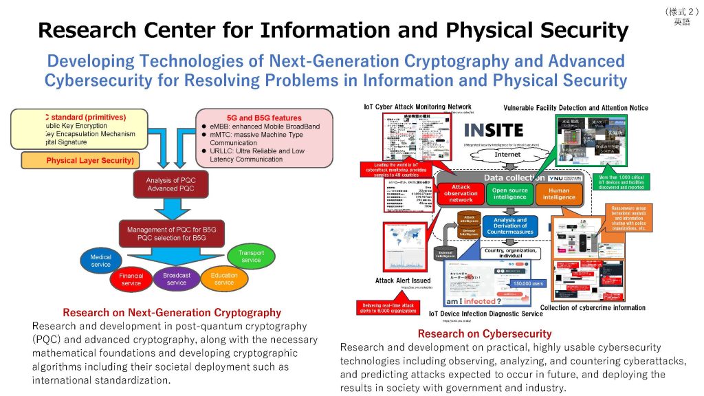 Research activities in cryptography and information security at YNU began in the 1980s and have significantly contributed to the community of information security and cryptography in Japan. Furthermore, we continue to conduct cutting-edge research in Japan on next-generation cryptographic technologies and cybersecurity technologies, and have outstanding research achievements including of high-level publications, huge funding acquisition, many domestic and international awards, and the international standardization of developed technologies. This research center aims to continue advancing research activities at a high level. In future, next-generation cryptographic and cybersecurity technologies are indispensable for building a safe and secure information society globally and in Japan. Therefore, from the perspective of developing these technologies, this research center aims to solve unsolved problems in information and physical security. By conducting research that bridges theory, application, and practice across broad security fields, it seeks to advance internationally outstanding academic publications, the international standardization of developed technologies, and the societal implementation of research outcomes through industry-academia collaboration.
