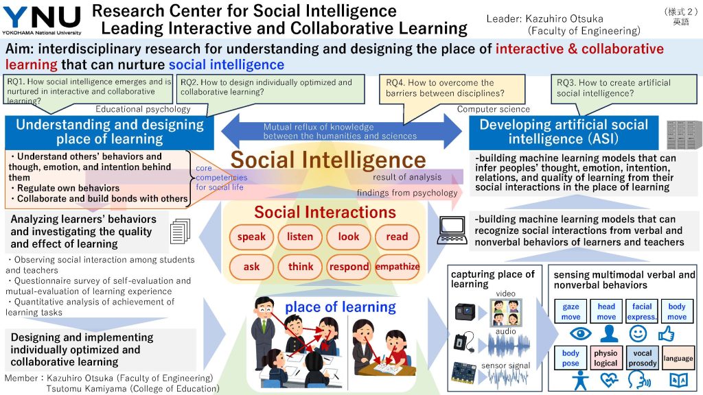 This research center aims to create artificial social intelligence (ASI) that can understand human social intelligence and discover the design principle for the place of interactive and collaborative learning. Social intelligence refers to an essential competence to understand others’ behaviors, emotions, and the intention behind them, and to collaborate and build relationships with others in our society. Focusing on the social interactions among students and teachers, this study tries to create and exploit the ASI to quantitatively analyze the interactions and aims to develop educational methods optimized for individual students, based on the ASI's analysis. This research center also aims to explore the potential of interdisciplinary collaboration between computer scientists and educational psychologists, by connecting two problems building ASI and designing education for nurturing human social intelligence.